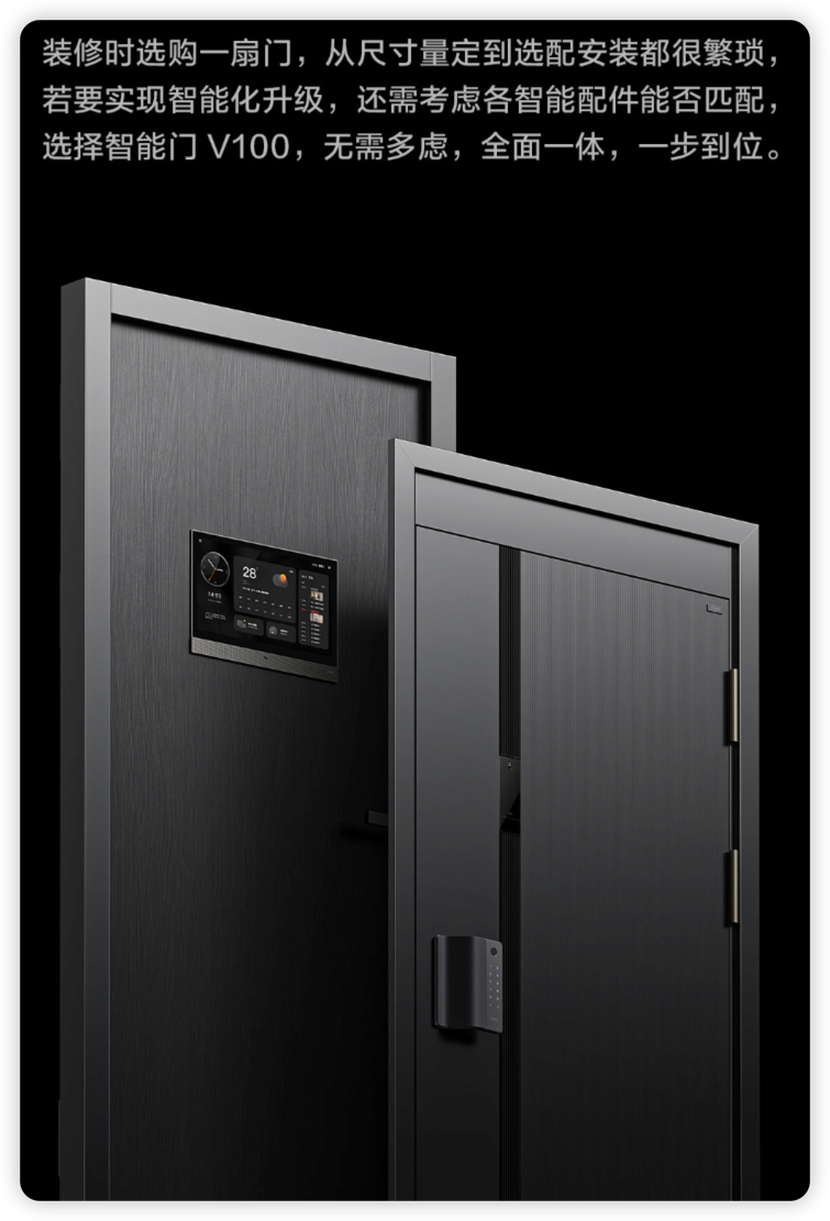 6月15日,智能家居独角兽企业 Aqara 推出了旗下首款智能门——Aqara 智能门 V100。Aqara 智能门 V100集智能猫眼、智能门锁、妙控屏一体设计,你家的入户门一站式解决方案,支持全尺寸定制,多色搭配。