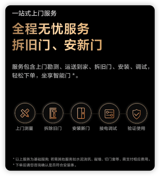 Aqara 智能门 V100服务包含上门勘测、运送到家、拆旧门、安装、调试,轻松下单,坐享智能门。