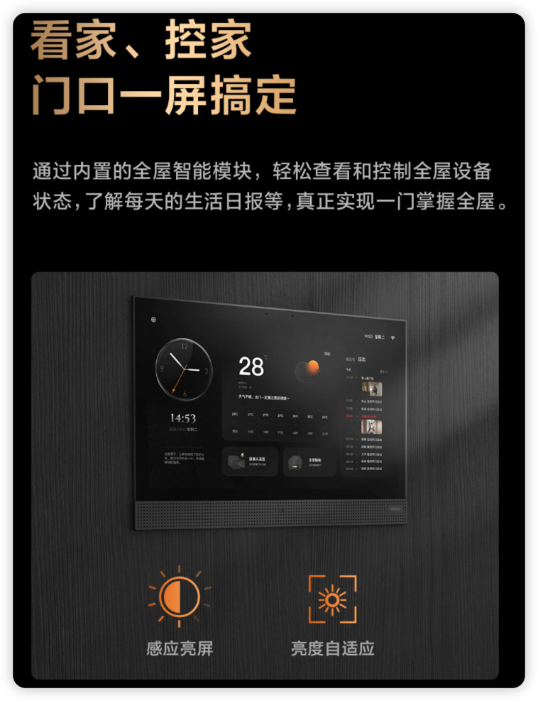 Aqara 智能门 V100配备一块 15.6 英寸的全屋妙控屏,可以轻松查看和控制全屋设备状态,了解每天的生活日报等,实现一门掌控全屋。