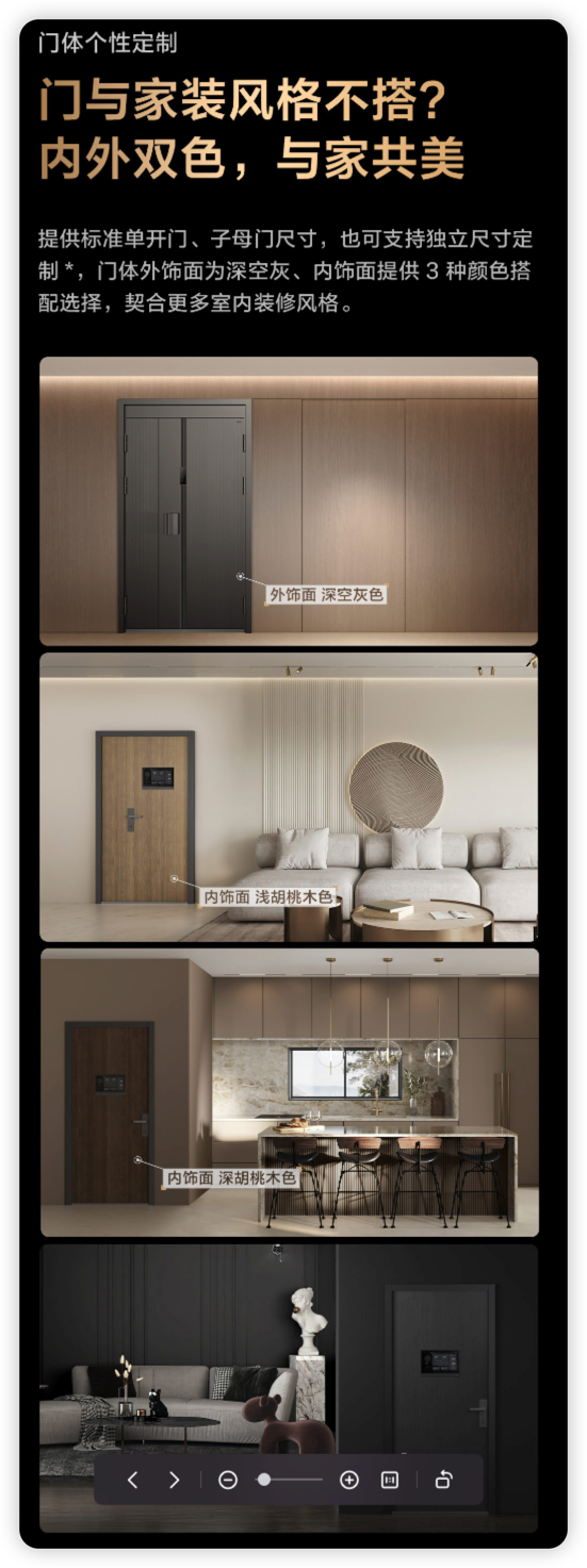 Aqara 智能门 V100不仅提供标准单开门、子母门尺寸,也可以支持独立尺寸定制,并且门体外饰面为深空灰、内饰面提供3种颜色搭配。