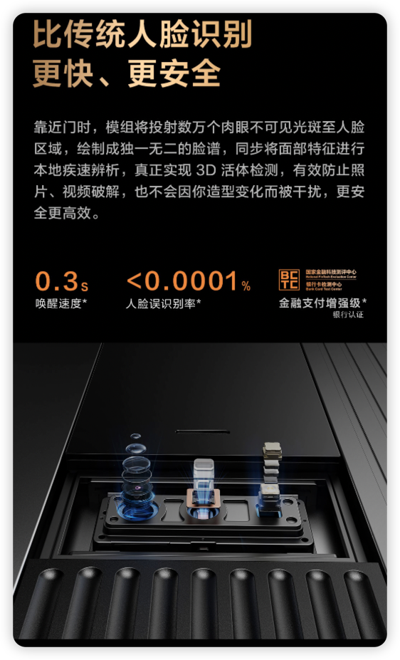 Aqara 智能门 V100 采用3D 结构光人脸识别,靠近门时,模组将投射数万个肉眼不可见光斑至人脸区域,绘制成独一无二的脸谱,同步将面部特征进行本地疾速辨析,实现3D活体检测,更安全、高效。