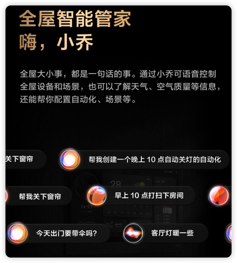 通过小乔可语音控制全屋设备和场景,也可以了解天气、空气质量等信息,还能自动帮你配置自动化、场景