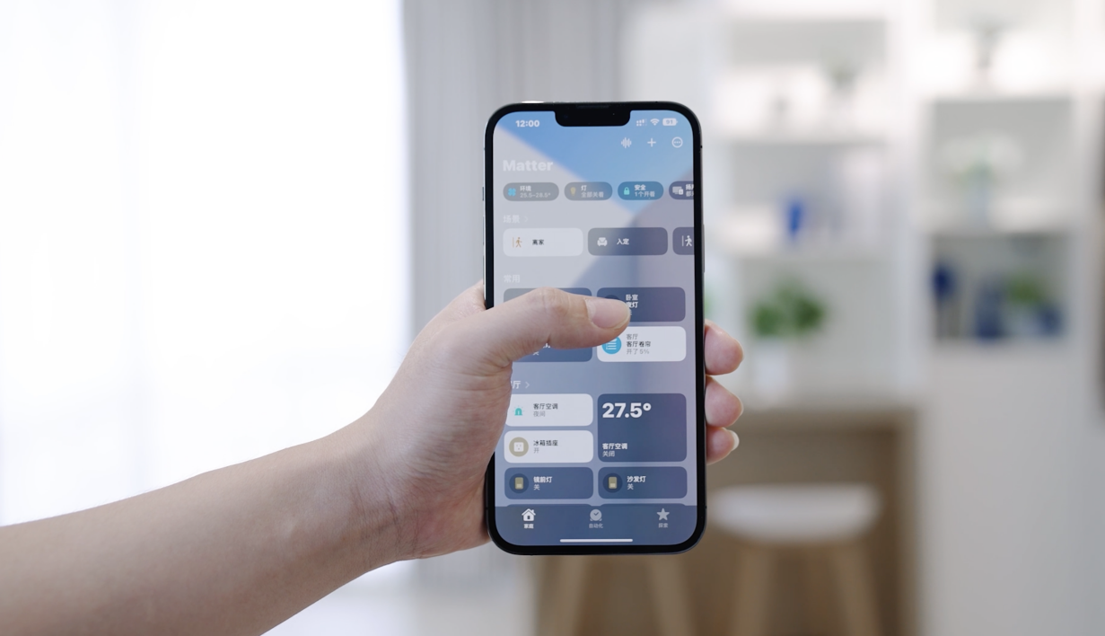 还可以翻转魔方,关闭窗帘;有人经过,灯光自动亮起;回家开门,温控器自动开启;妙控屏控制所有Matter设备,不同生态平台之间的通信变得畅通无阻。而且即使在断网情况下也能保持稳定运行。